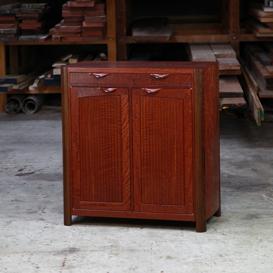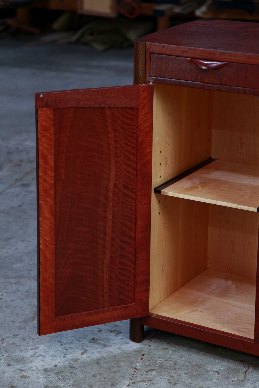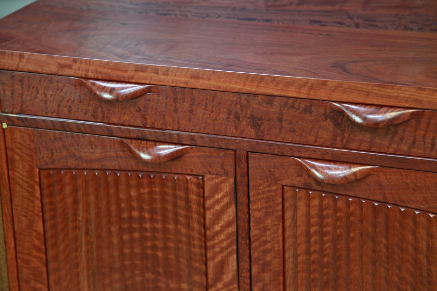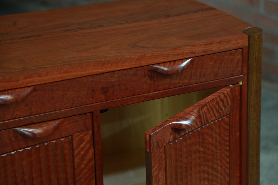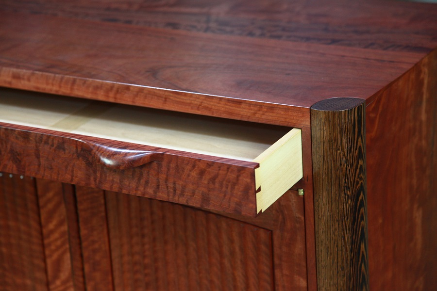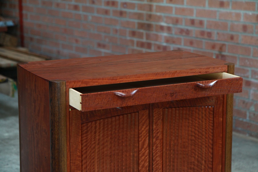 The Riverstones II Drinks Cabinet was made for the Studio Furniture 18 competition and exhibition at the Bungendore Wood Works Gallery. This design, with its fluted panels in river red gum and distinctive wenge legs, has themes and ideas that we have been playing with for years. Riverstones II was the first purely exhibition piece that we have made in years. With such a great client base, most of our experimental work in recent years has been to commission. With Riverstones II, we simply got to play. One of my key concerns was to show the use of “difficult” Australian timbers (hence the red gum) but also show that we are not completely parochial (hence the wenge and rock maple).